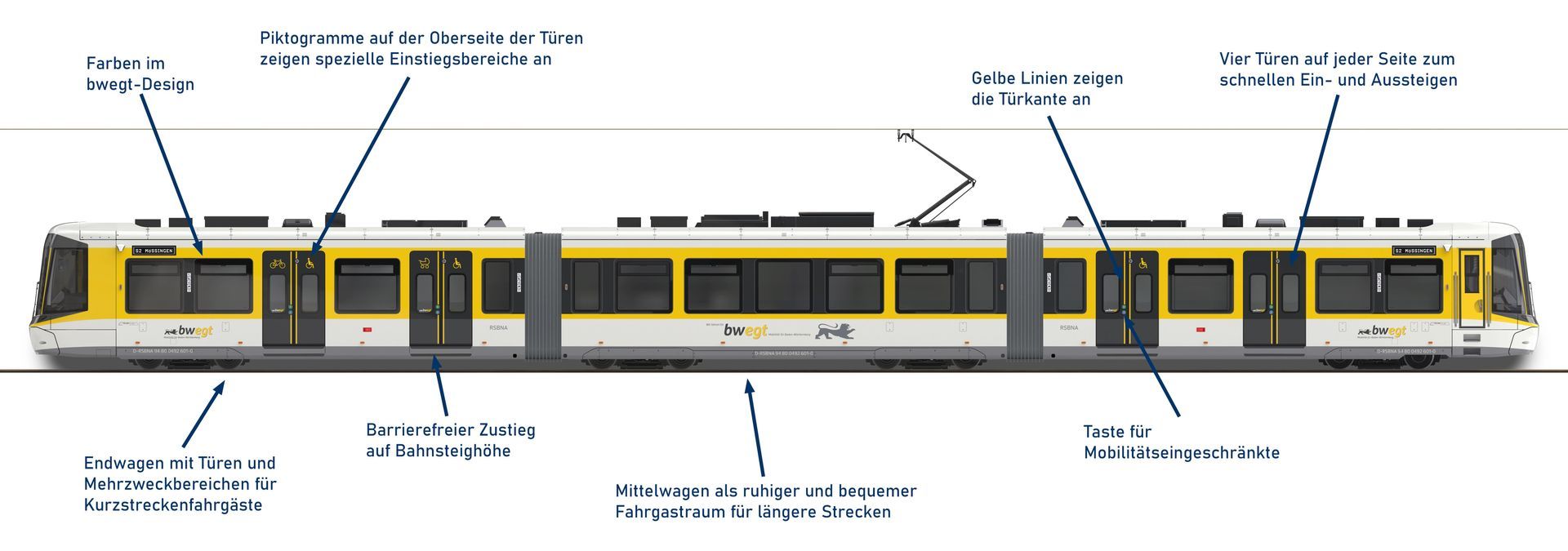 Design-Merkmale des TramTrain im gelb-schwarzen bwegt-Design, Stand: Juli 2024, ©Tricon AG