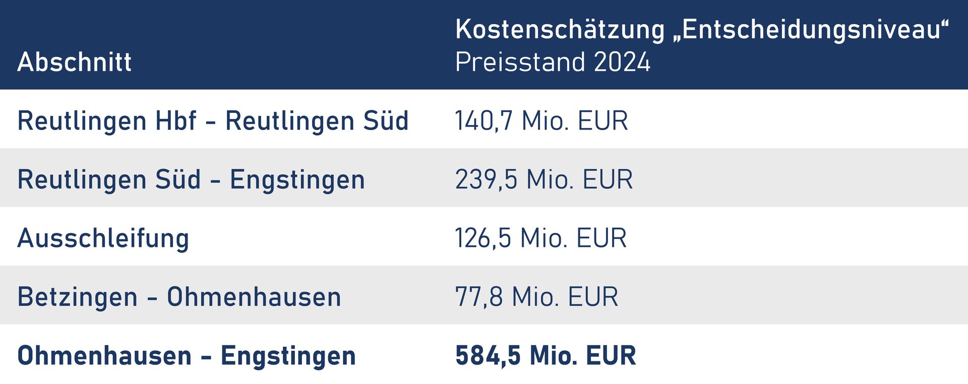 Im Rahmen der Vorplanung wurde eine neue Kostenschätzung erarbeitet. Nach dieser betragen die Kosten für den Bau der Straßenbahnstrecke von RT-Ohmenhausen bis nach Engstingen ca. 584,5 Mio. EUR (Preisstand 2024).