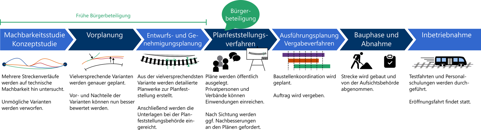 In Deutschland gibt es für die Planung von größeren Bauprojekten viele gesetzliche Regelungen und Vorgaben. Bereits vor Baubeginn müssen zahlreiche Untersuchungen zu Auswirkungen auf Umwelt, Pflanzen- und Tierwelt angestellt werden. Rein technisch gesehen könnten Bauplanungen schneller laufen, aber es müssen eben alle Argumente und Auswirkungen betrachtet und berücksichtigt werden. Wie läuft also dieser Planungsprozess bei der Regional-Stadtbahn ab?